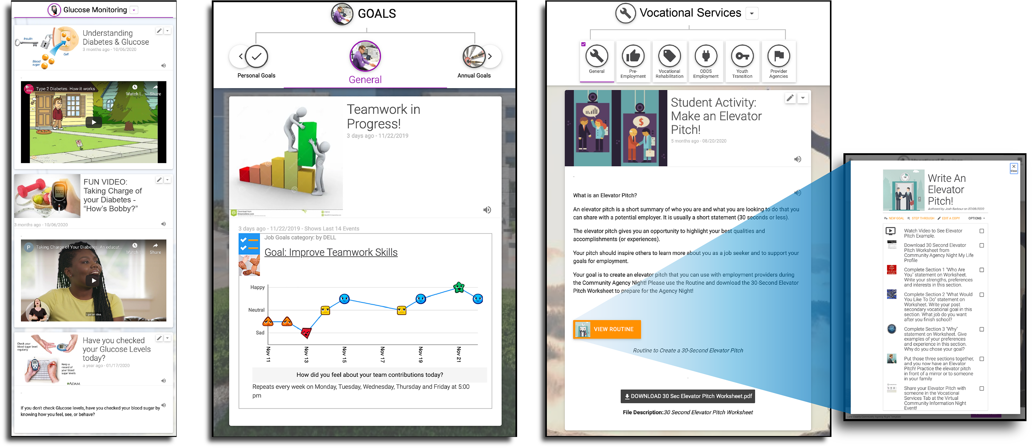 Goal Guide makes it possible for people to easily create goals, track progress, and share accomplishments with others. Goal Guide can be used as an activity reminder and scheduling system or as a prompting tool with an emphasis on video modeling and task analysis to support task accomplishment.